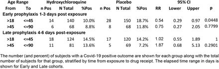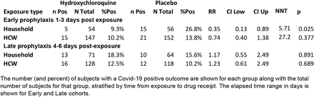 RESULTS Requesting additional data, we found that 52% of subjects received medication 1-2 days after the intended overnight delivery; 19% of them outside the intended four-day window from exposure. After re-analysis, there was a reduced incidence of Covid-19 associated with HCQ compared with placebo (9.6% vs. 16.5%) when received up to 3 days (Early) after exposure (RR 0.58, 95%CI 0.35 – 0.97; p=0.044; NNT 14.5) but not later (Late) (RR 1.22, 95%CI 0.72 – 2.04).