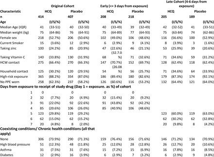 Table 2: Demographic and clinical characteristics, stratified into Early and Late Cohorts The data for the original cohort recreates data from the original paper, for comparison and quality control purposes. Several variables have been added. The data are stratified into Early (1-3 days) and Late (4-6 days) post exposure prophylaxis cohorts. (I/S/%) – Shown in parentheses are interquartile ranges (1st and 3rd quartile), or standard deviations where indicated. All other values within parentheses indicate the percent contribution to the cohort total. See Table S 1 for full list of demographic and clinical characteristics.