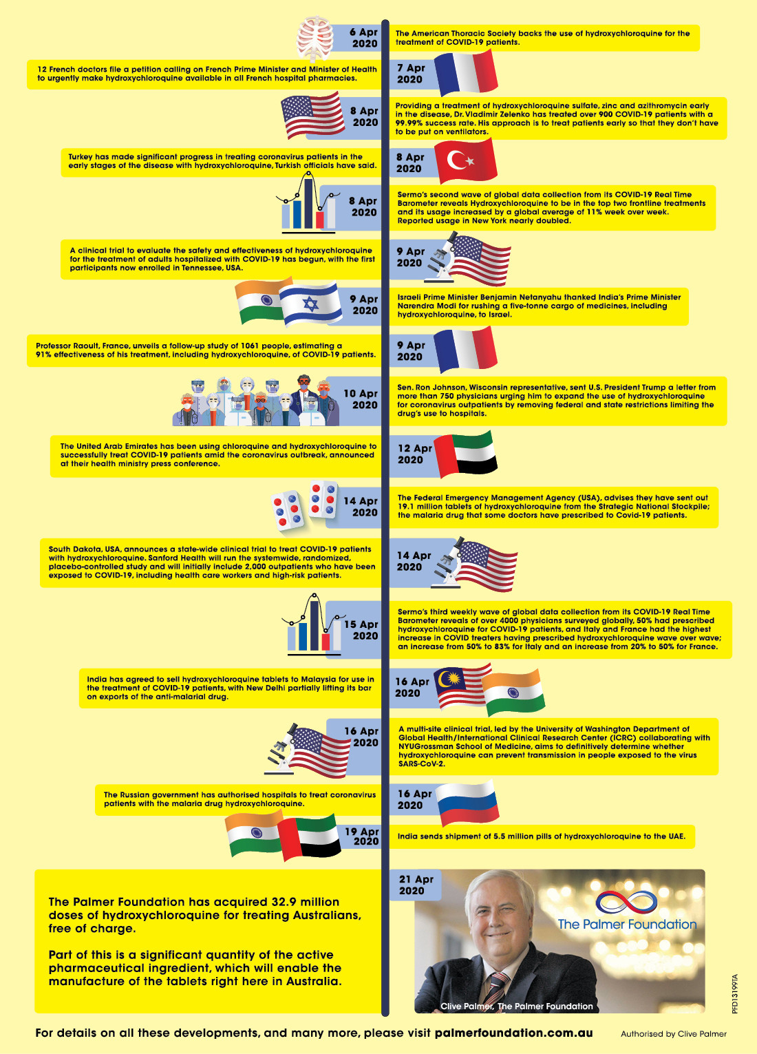 That’s why The Palmer Foundation is making resources available to fund clinical trials, scale up the availability of hydroxychloroquine as soon as we can, and have enough of the drug available for all Australians, free of charge.